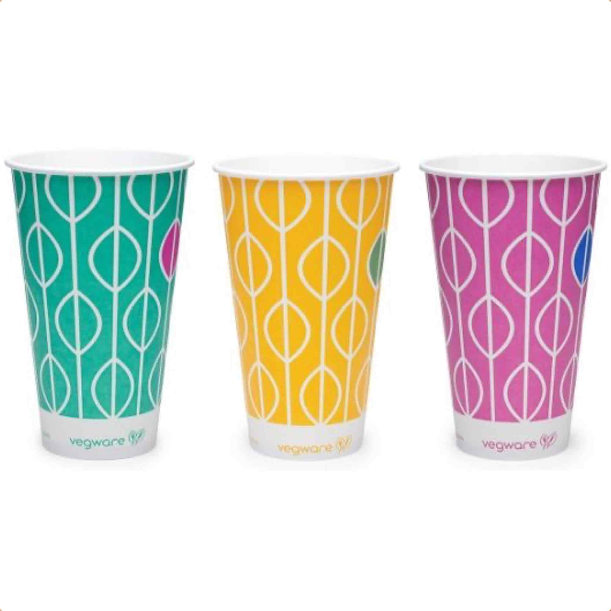 Plant-based paper cold drink cups. Each sleeve has a vibrant mix of colours: tropical mango, sea green and big island...